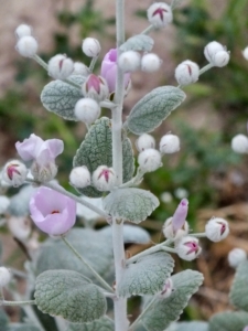 Origine: Caalfornie . Froid: en terrain drainé -10°. Fleur: rose pâle, presque transparente. Feuillage gris persistant. Arrosage un peu la première année. Pas d’arrosage ensuite. À réserver dans les espaces libres et assez grand car c’est une plante qui s’installe par les racines.